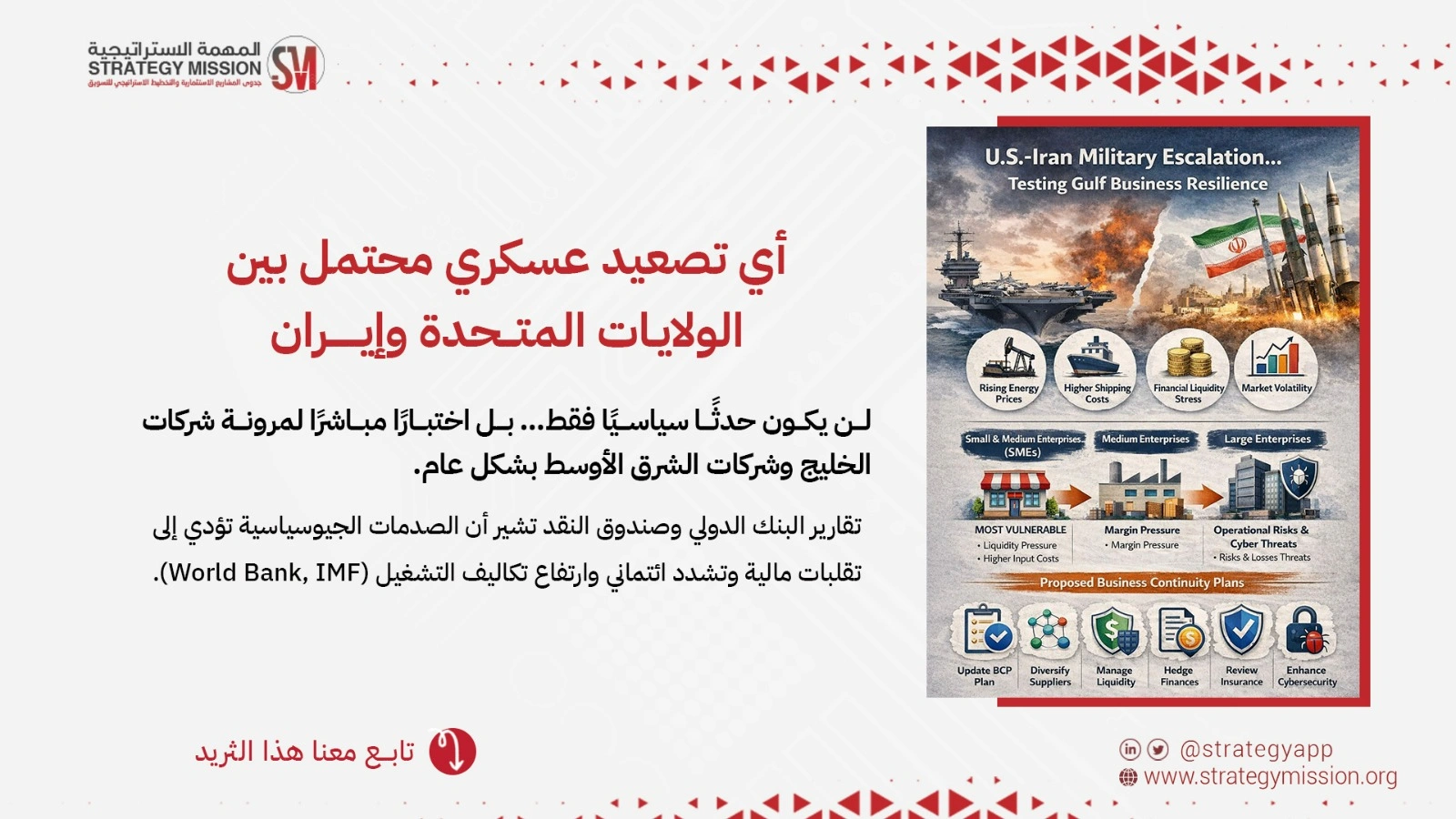 التوترات الجيوسياسية واستمرارية الأعمال أصبحت من أهم التحديات التي تواجه الشركات في الخليج والشرق الأوسط. أي تصعيد عسكري محتمل لا ينعكس فقط على السياسة، بل يؤثر بشكل مباشر على العمليات والتكاليف والاستقرار المالي.