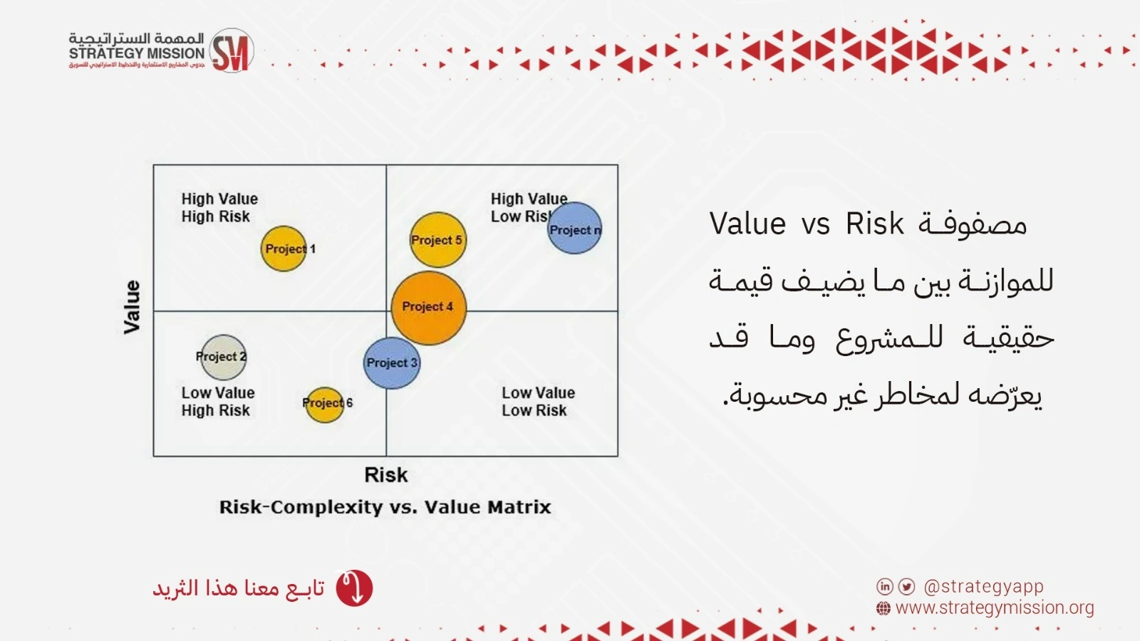 - قيمة عالية + مخاطر عالية: قرارات استراتيجية تتطلب إدارة دقيقة للمخاطر.