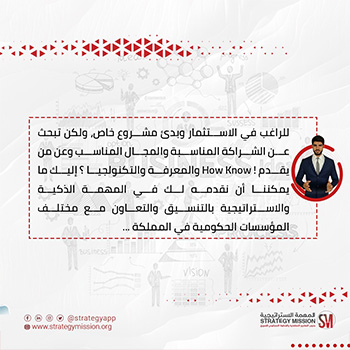 إليك ما يمكننا أن نقدمه لك (كمستثمر محلي أو أجنبي أو مختلط) في المهمة الذكية والاستراتيجية بالتنسيق والتعاون مع مختلف المؤسسات الحكومية في المملكة :
