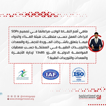 ماهي أهم النقاط الواجب مراعاتها في تصميم SOPs اجراءات العمل حسب متطلبات هيئة الغذاء والدواء فيما يتعلق بالشركات الموردة للاجهزة والمعدات والتوريدات الطبية في المملكة حسب معطيات المواصفة الدولية الأيزو 13485 لإدارة الأجهزة والمعدات والتوريدات الطبية ؟