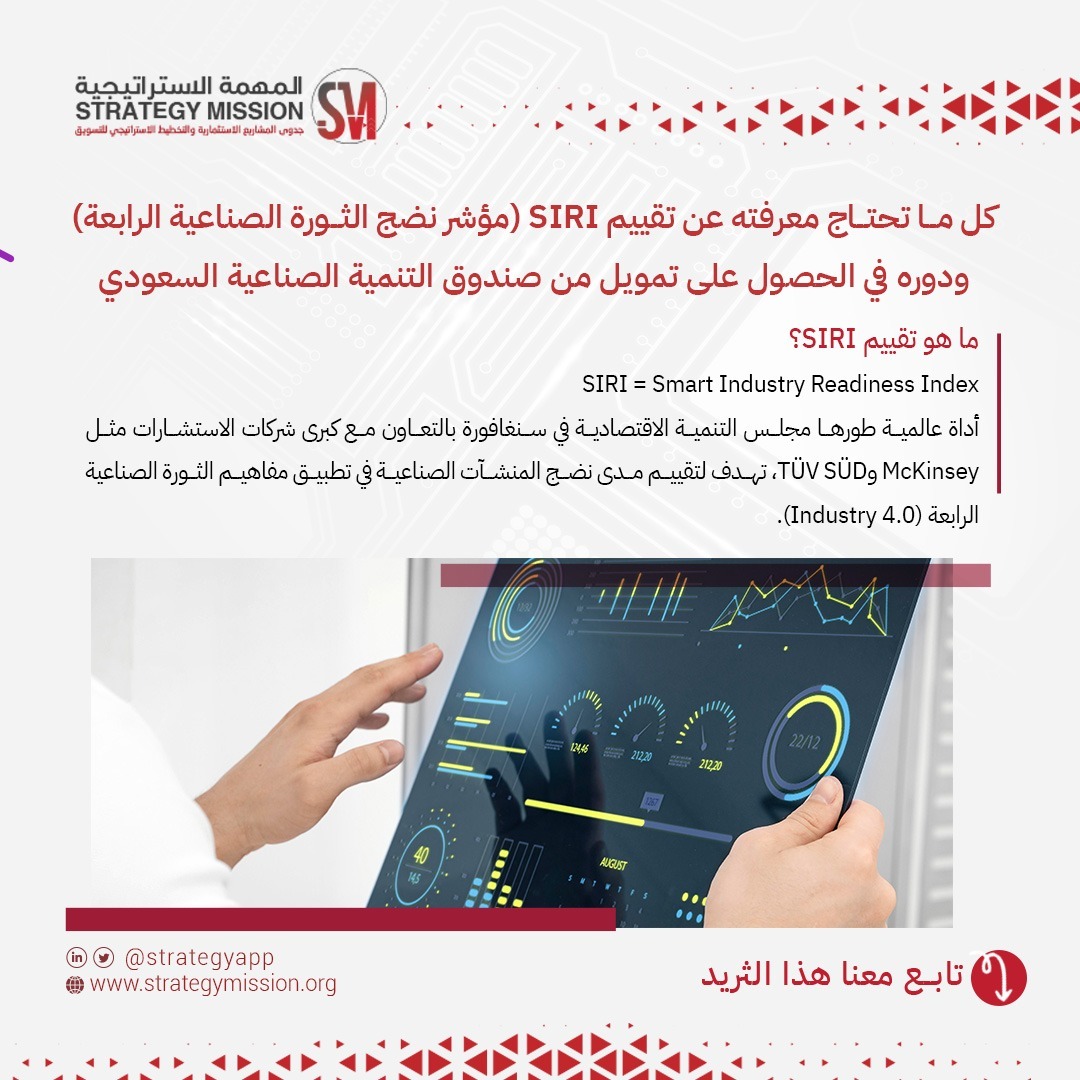 مؤشر نضج الثورة الصناعية الرابعة SIRI هو أداة تقييم استراتيجية تُستخدم لتحديد مدى جاهزية المصانع والمنشآت الصناعية لتطبيق تقنيات Industry 4.0. في السعودية، أصبح هذا المؤشر أحد المعايير الأساسية للحصول على التمويل من صندوق التنمية الصناعية.